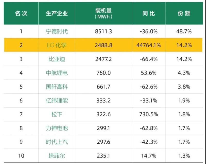 與2019年同期相比,除寧德時(shí)代的名次仍在榜首,其他企業(yè)名次均有變化,中航鋰電升幅最大,從第八升至第四;力神降幅最大,從第四降至第八。比亞迪從第二跌至第三,國(guó)軒高科從第三降至第五,億緯鋰能從第五降到第六,時(shí)代上汽從第七降至第九。而孚能科技、比克、多氟多被淘汰出前十。