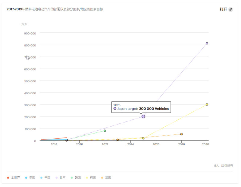2017-2019年燃料電池電動(dòng)汽車(chē)的部署以及部分國(guó)家/地區(qū)的發(fā)展目標(biāo)