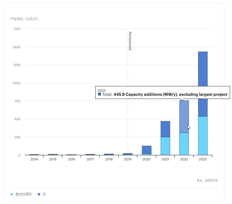 2014~2023年全球已投運(yùn)和計(jì)劃投運(yùn)電解氫產(chǎn)能(最大項(xiàng)目和總項(xiàng)目)