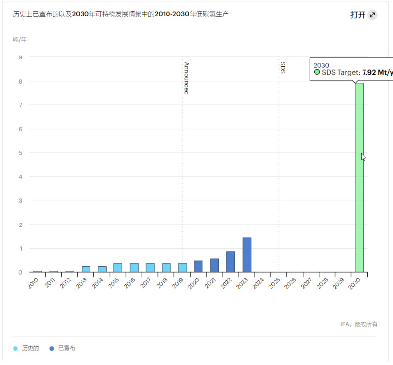 歷史上已宣布的以及2030年可持續(xù)發(fā)展情景(SDS)中的2010-2030年低碳?xì)渖a(chǎn)