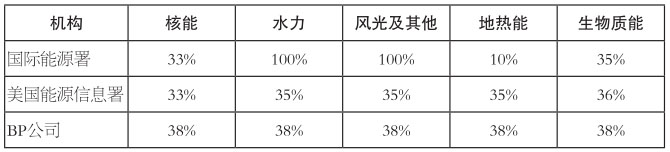 在折算系數(shù)方面,三家機(jī)構(gòu)統(tǒng)計(jì)方法的差異并不在煤炭、石油、天然氣等化石能源,而是在核能、可再生能源。因?yàn)榍罢叩哪芰亢肯鄬?duì)容易測(cè)量,且能源供給消費(fèi)鏈也相對(duì)容易追蹤;后者的一次能源量要么難以直接測(cè)量得到,要么無法追蹤其產(chǎn)業(yè)鏈,通常的做法是首先獲得這些能源所產(chǎn)生的電能,然后除以折算系數(shù)得到標(biāo)準(zhǔn)單位的一次能源量,而差異主要就在于各機(jī)構(gòu)采用了不同的折算系數(shù)。在國際能源署的統(tǒng)計(jì)中,核能折算系數(shù)的33%為典型核電站蒸汽發(fā)生器的假定效率;水能、風(fēng)能、太陽能及其他能源(如潮汐能)采用了“捕獲能源”的思路,即只統(tǒng)計(jì)所發(fā)電力的能源含量,或稱“電熱當(dāng)量法”;地?zé)崮苷鬯阆禂?shù)為10%,體現(xiàn)了其較低的轉(zhuǎn)換效率;生物質(zhì)能選用35%,因其具有與化石能源相同的可燃性。在美國能源信息署的統(tǒng)計(jì)中,核能折算系數(shù)與國際能源署相同,為33%;水能、風(fēng)能、太陽能、地?zé)崮艿炔豢扇伎稍偕茉催x用了“化石燃料等效法”,折算系數(shù)為35%;生物質(zhì)處理方式與國際能源署類似,但折算系數(shù)略高,為36%。在BP公司的統(tǒng)計(jì)中,核能、可再生能源的折算系數(shù)均選用38%,為經(jīng)合組織國家火力發(fā)電效率的平均值,全部采用“化石燃料等效法”。
