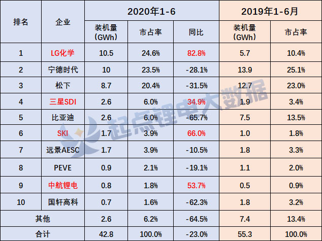 受新冠疫情影響,全球電動汽車銷量低迷,因此裝機量也同比下滑。今年上半年,全球動力電池裝機量為42.6GWh,同比減少了23.0%,其中中國動力電池總裝機量為17.5GWh,同比下降41.6%。