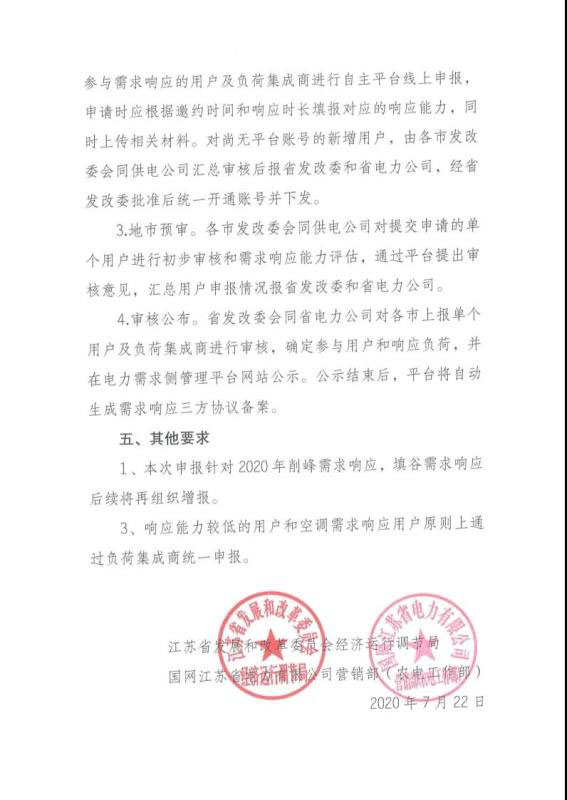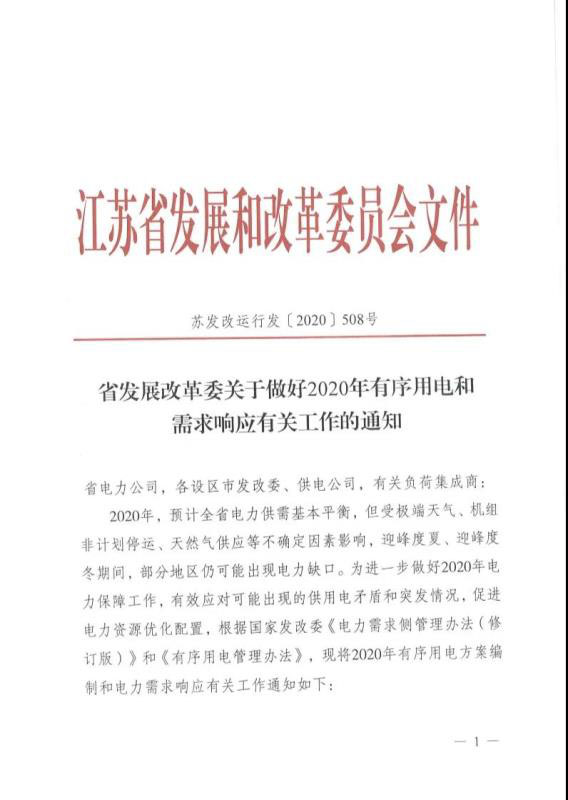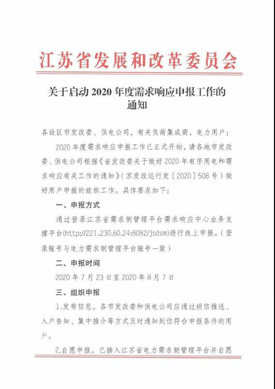 江蘇省發(fā)布了?關(guān)于啟動2020年度需求響應(yīng)申報工作的通知?,本次申報針對2020年削峰需求響應(yīng),填谷需求響應(yīng)后續(xù)將再組織增報。響應(yīng)能力較低的用戶和空調(diào)需求響應(yīng)用戶原則上通過負荷集成統(tǒng)一申報。