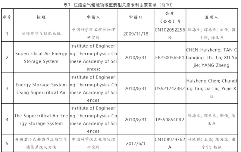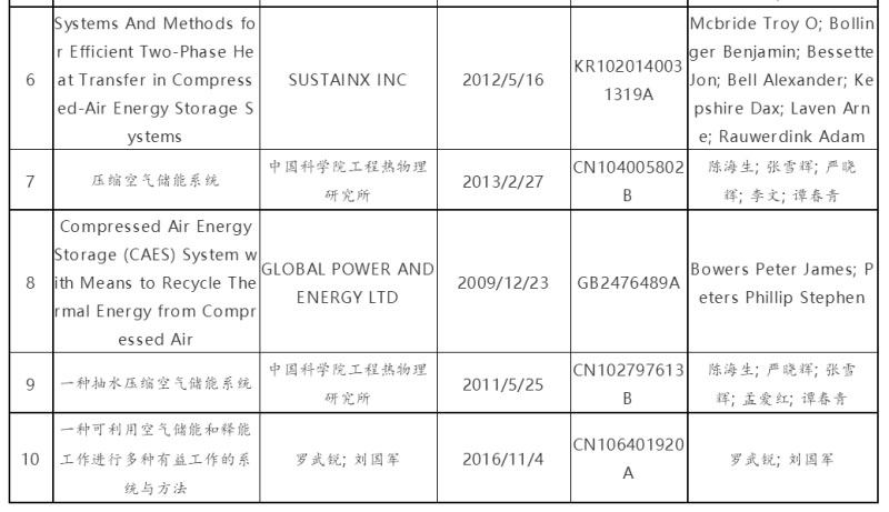根據(jù)檢索結(jié)果,按照檢索相關(guān)度及專利價(jià)值度綜合排序,列出壓縮空氣儲(chǔ)能領(lǐng)域前10件重要相關(guān)度的專利著錄信息。