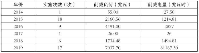在需求響應實施早期,實施目的主要是為了應對夏季高峰時段電力消費緊張狀況,最大程度削減高峰電力負荷對電網(wǎng)安全的影響,保障了民生用電和重點用電安全平穩(wěn)。2014~2019年度國內(nèi)開展削峰需求響應的情況如下表所示。