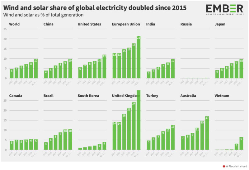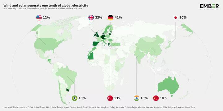 許多主要國家現(xiàn)在大約十分之一以上的電力來自風(fēng)能和太陽能:中國(10%)、美國(12%)、印度(10%)、日本(10%)、巴西(10%)、土耳其(13%)、英國(33%)、德國(42%),而歐盟的風(fēng)能和太陽能占比為21%。俄羅斯是迄今為止基本沒有發(fā)展風(fēng)能和太陽能的國家,只有0.2%的電力來自風(fēng)能和太陽能。