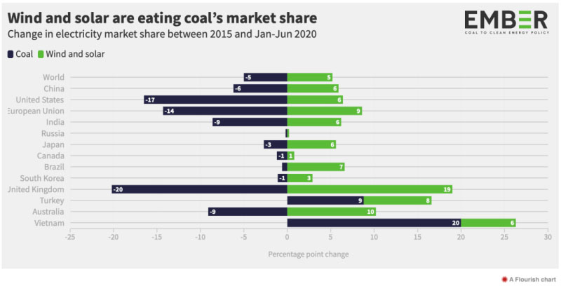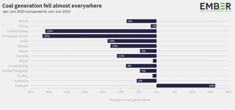 與2019年上半年相比,全球煤炭發(fā)電量在2020年上半年下降了8.3%。這是繼2019年同比下降3%之后,1990年以來的創(chuàng)紀(jì)錄跌幅。2020年上半年的煤電下降70%可歸因于新冠疫情導(dǎo)致的電力需求下降,但30%可歸因于風(fēng)能和太陽能發(fā)電量的增加。美國和歐盟正競相減少煤電,降幅分別為31%和32%。中國煤電只下降了2%,這意味著中國在全球煤炭發(fā)電量中的份額從2019年的50%上升到今年上半年的54%;而2015年時中國煤電占全球比例為44%。