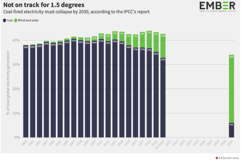 為了實現(xiàn)巴黎協(xié)定的溫升不超過1.5攝氏度的目標(biāo),在未來10年中煤電需要每年下降13%。但是,即使在全球性的新冠疫情大流行期間,煤炭發(fā)電量在2020年上半年也只下降了8%。因此,在目前的趨勢下,實現(xiàn)巴黎協(xié)定的目標(biāo)無望。