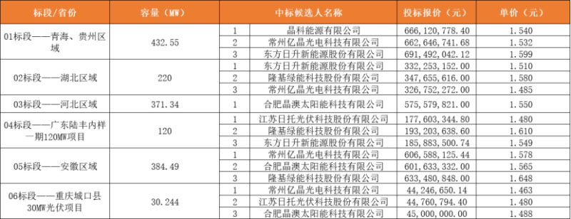在中廣核1.558GW的組件集采中,晶科(432.55MW)、東方日升(220MW)、晶澳(371.34MW)、日托(120MW),億晶擬中標(biāo)兩個(gè)標(biāo)段,共計(jì)414.734MW規(guī)模。光伏們匯總了6個(gè)標(biāo)段組件中標(biāo)候選人情況,具體中標(biāo)結(jié)果詳見(jiàn)下表: