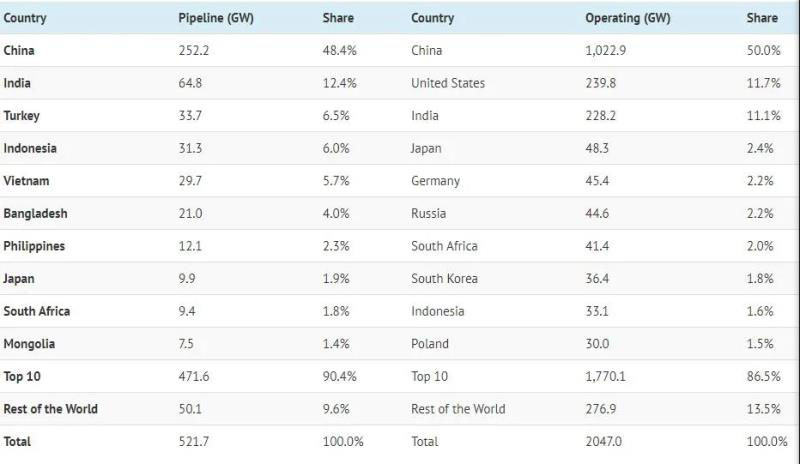 從上圖可以看出,煤電仍集中在少數(shù)幾個(gè)國(guó)家,其中全球前10個(gè)國(guó)家占據(jù)了在建煤電的90%以及在運(yùn)營(yíng)煤電的86%。