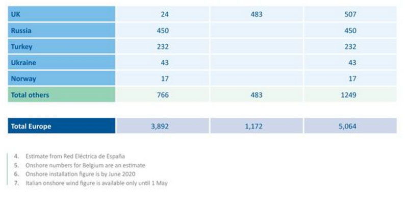 盡管風(fēng)能行業(yè)在上半年受到嚴(yán)重干擾,但裝機(jī)水平與前幾年相當(dāng)。 下表為2020年上半年歐洲各國(guó)裝機(jī)統(tǒng)計(jì)表。