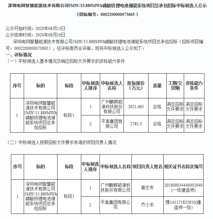 近日,深圳電網智慧能源技術公司5MW/15.889MWh磷酸鐵鋰電池儲能系統(tǒng)項目EPC中標候選人公示,鵬輝能源以投標單價1.65元/Wh獲得中標。資料顯示鵬輝能源是國內主要電池供應商之一,在2020年上半年動力電池裝機量排名中位于第11位。2019年4月,鵬輝能源曾與天合光能全資子公司天合科技達成合作,注冊資本為3億元,鵬輝能源持股51%,雙方共同出資成立江蘇天輝鋰電池有限公司、布局儲能市場。此次是鵬輝能源首次參與中標儲能項目EPC。