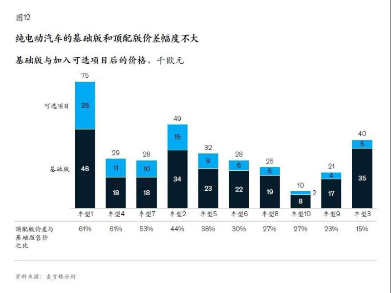 這10款車型中的7款從基礎(chǔ)版到頂配版的價(jià)差幅度不超過50%(圖12)。10款中有5款提供方案以外的電池或發(fā)動(dòng)機(jī)升級(jí),有三款提供更昂貴的車身選擇,比如顏色和輪轂。由此來看,在定價(jià)策略或非硬件收入方面(例如無線軟件更新)似乎存在著有待挖掘的收入潛能??傊?,國際汽車廠商可將我們的研究發(fā)現(xiàn)視為簡化產(chǎn)品組合或?qū)で蟛町惢膮⒖?,尤其是?dāng)它們考慮進(jìn)入中國市場時(shí)。