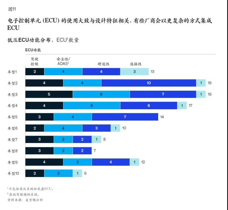 電子電氣架構(gòu)。本次對(duì)標(biāo)測試顯示,在具備相似功能的車型之間,低壓線束的重量各有不同。這表明在電子電氣架構(gòu)中存在重大的設(shè)計(jì)和成本優(yōu)化空間。與此類似,參與此次測試的廠商各自選擇了不同的ADAS9功能,采用了不同的電子控制單元(ECU)集成設(shè)計(jì),所使用的ECU數(shù)量也各不相同。這些車型裝配了6~19個(gè)分散式ECU(圖11)。一個(gè)潛在的發(fā)展方向是將所有功能集成在單一汽車控制器中,如美國一家純電動(dòng)汽車廠商的做法。藉此,廠商或可以相對(duì)較低的成本實(shí)現(xiàn)性能提升,但這需要大量研發(fā)投資,以及先進(jìn)的內(nèi)部軟件開發(fā)能力。