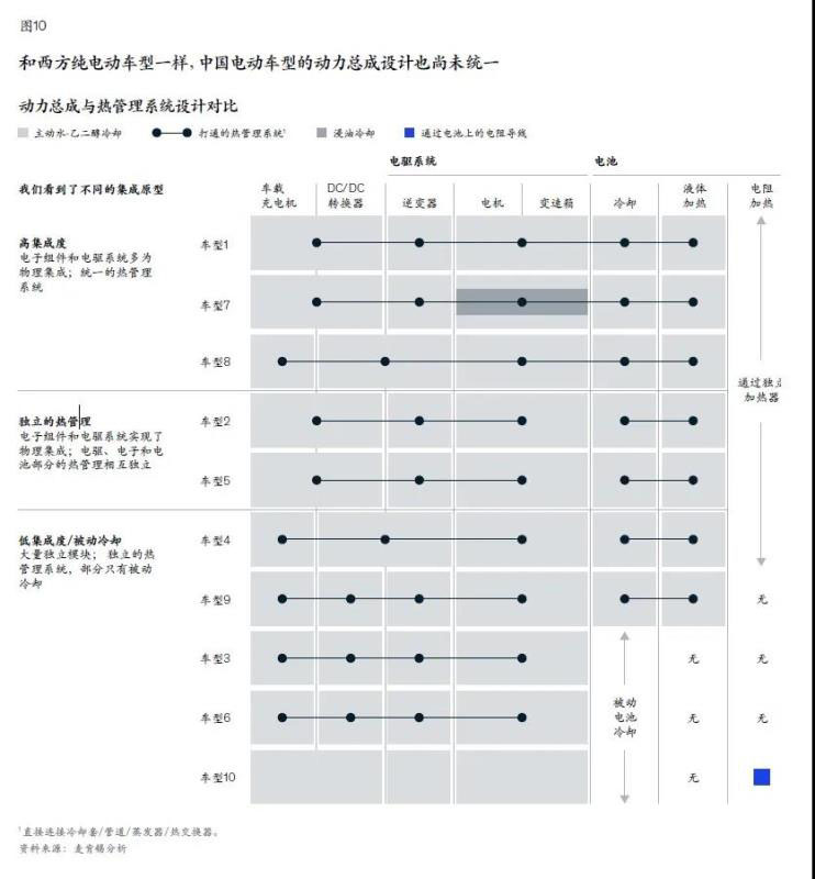 此外,物理集成度也各不相同。只有三個(gè)車型顯示了較高的集成水平:電子組件和電氣驅(qū)動(dòng)系統(tǒng)實(shí)現(xiàn)了物理集成,且熱管理系統(tǒng)涵蓋了所有組件。另有兩個(gè)車型顯示出相同的物理集成水平,但電驅(qū)系統(tǒng)和電池部分的熱管理系統(tǒng)是分離的。其余車型使用了較少集成組件:單獨(dú)的電氣模塊和單獨(dú)的熱管理。其中三個(gè)車型使用了被動(dòng)風(fēng)冷方式,此類車型相比使用電池水冷技術(shù)的車型,充電速度受限(圖10)。
