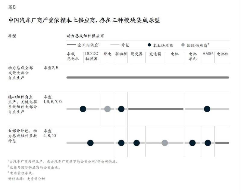 就推進(jìn)產(chǎn)業(yè)化而言,當(dāng)前的供應(yīng)商生態(tài)系統(tǒng)加速了產(chǎn)品上市。中國在電機(jī)生產(chǎn)、半導(dǎo)體、電子產(chǎn)品,尤其是電池方面的長期積累,使得本地公司有能力提供電動(dòng)汽車動(dòng)力總成系統(tǒng)所需的所有零部件(圖8)。由于垂直整合水平各異,汽車廠商通過本地供應(yīng)商采購的動(dòng)力總成系統(tǒng)零部件比例在45%~100%之間。