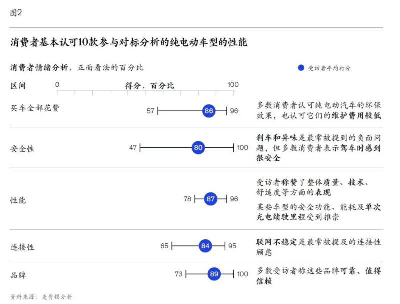 許多專為中國消費(fèi)者設(shè)計(jì)的新車型促進(jìn)了純電動(dòng)汽車增長,2019年,愿意考慮純電動(dòng)汽車的消費(fèi)者比率高達(dá)80%。針對(duì)10種對(duì)標(biāo)車型的消費(fèi)者態(tài)度分析顯示,消費(fèi)者的平均認(rèn)可率達(dá)到85%,反映出所有汽車廠商都能根據(jù)客戶需求量身定制產(chǎn)品(圖2)。