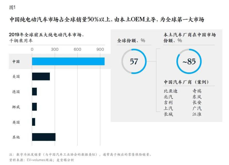 中國汽車市場是全球汽車業(yè)最大的利潤池,貢獻(xiàn)了全球總利潤的1/3(約400億美元)。如今,這個(gè)市場正轉(zhuǎn)向電動(dòng)出行。2014-2019年間,純電動(dòng)汽車在中國的銷量每年增長80%。2019年中國的純電動(dòng)汽車銷量超過了90萬輛,全球售出的純電動(dòng)汽車當(dāng)中,有57%是在中國市場售出的,使中國當(dāng)仁不讓成為全球最大的純電動(dòng)汽車市場。而從OEM市場份額來看,中國廠商幾乎完全壟斷了這個(gè)市場。2019年,國際汽車廠商在純電動(dòng)汽車市場年銷售量中僅占15%的份額(圖1)。