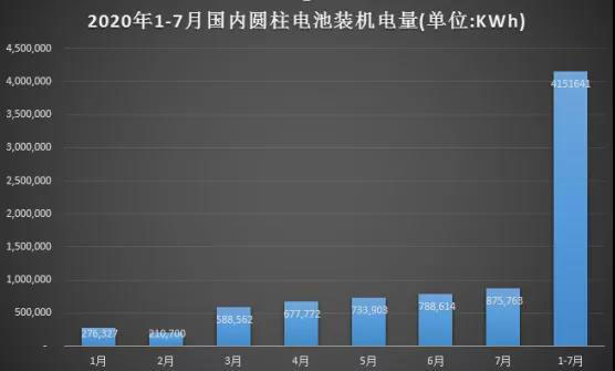 高工產(chǎn)業(yè)研究院(GGII)通過發(fā)布的《動力電池月度數(shù)據(jù)庫》統(tǒng)計顯示,2020年1-7月國內(nèi)動力電池裝機電量約22.49 GWh,其中圓柱電池裝機量約4.15GWh,同比增長48%,占總體的18.5%。