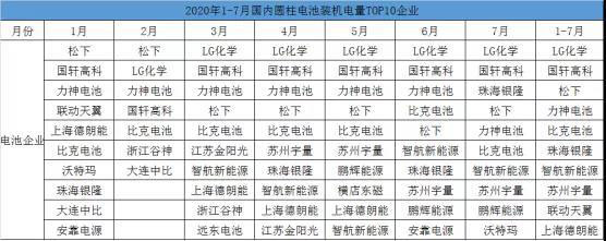 具體來看,1-7月國內(nèi)圓柱電池裝機電量TOP10排名波動較大,裝機電池企業(yè)數(shù)量和裝機電量都大幅減少。甚至在疫情最嚴重的2月份,圓柱電池裝機企業(yè)銳減至7家。