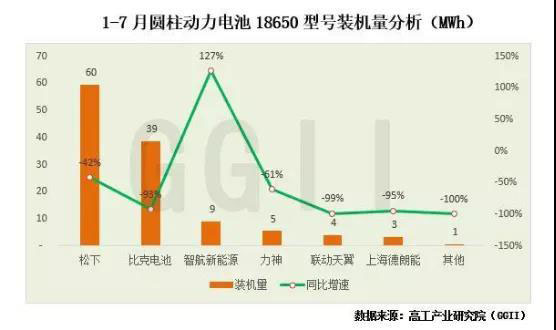 GGII統(tǒng)計數(shù)據(jù)顯示,2020年1-7月圓柱動力電池18650裝機量約0.12GWh,同比下降90%。僅智航新能源18650電池與去年同期相比裝機量出現(xiàn)增長之外,其余電池企業(yè)的18650裝機量均出現(xiàn)不同程度的下滑。