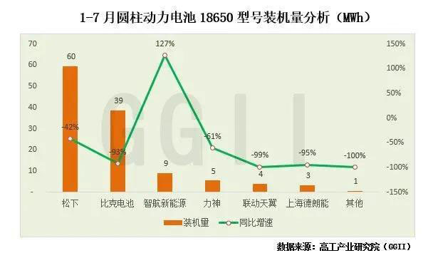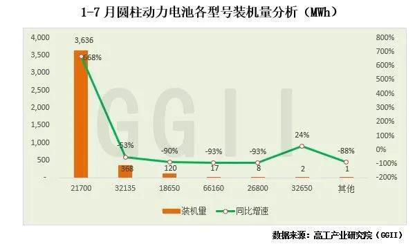 從具體型號(hào)來看,2020年1-7月圓柱動(dòng)力電池21700裝機(jī)量約3.64GWh,同比增長668%。