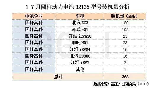 2020年1-7月圓柱動(dòng)力電池32135裝機(jī)量約0.37GWh,同比下降53%。目前該型號(hào)動(dòng)力電池僅國軒高科有配套裝機(jī),電池系統(tǒng)能量密度最高為140.24Wh/kg,配套裝機(jī)在江淮iEV7車型上。