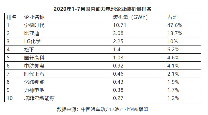 中國(guó)汽車(chē)動(dòng)力電池產(chǎn)業(yè)創(chuàng)新聯(lián)盟數(shù)據(jù)顯示,在2020年1-7月國(guó)內(nèi)帶來(lái)的企業(yè)裝機(jī)量排名中,LG化學(xué)和松下分列三、四名,僅次于寧德時(shí)代和比亞迪。