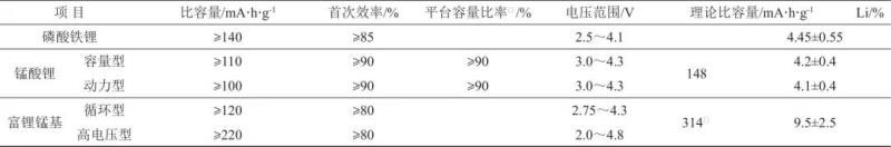 注: ① 平臺(tái)容量比率是基于全電池按3.6V平臺(tái)測(cè)算的,電壓范圍2.75~4.2V;② 鎳酸鋰按3.4V平臺(tái)測(cè)算;③ 為富鋰錳基的理論比容量按Li2MnO3-LiNi1/3Co1/3Mn1/3O2測(cè)算。