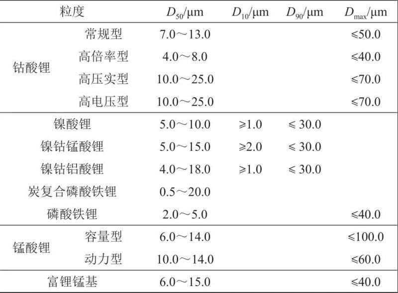 表5 正極材料標(biāo)準(zhǔn)中粒度要求