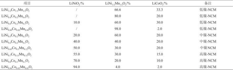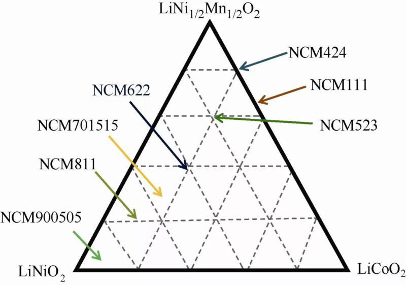 據(jù)此相圖,可將NCM分為低鎳(Ni<50%,摩爾分?jǐn)?shù))、中鎳(50%≤Ni≤65%)和高鎳(Ni>65%)等不同類型。低鎳-NCM材料特點(diǎn)是幾乎全部以空氣中穩(wěn)定的LiNi1/2Mn1/2O2和LiCoO2形式存在,不含穩(wěn)定性差的LNO組分,或LNO僅占10%以下,可以在空氣中像LCO、LMO那樣容易制備;中鎳-NCM材料的特點(diǎn)是LNO組分有所增多,但仍處于50%以下,稍加控制還可在空氣中制備;高鎳-NCM材料的特點(diǎn)是LNO組分占絕大多數(shù),必須在氧氣條件下才可制備。NCA材料類似于高鎳-NCM。