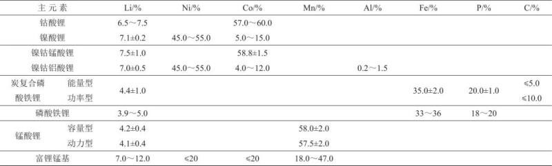 表2 正極材料標(biāo)準(zhǔn)中主元素含量要求