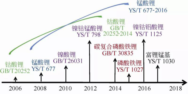 鋰離子電池正極材料在2000年前后開始國(guó)產(chǎn)化,最初進(jìn)入市場(chǎng)應(yīng)用的主要是鈷酸鋰和少量的錳酸鋰,因此GB/T 20252—2006《鈷酸鋰》是全國(guó)有色金屬標(biāo)準(zhǔn)化技術(shù)委員會(huì)組織發(fā)布的第1個(gè)正極材料國(guó)家標(biāo)準(zhǔn)。之后,《錳酸鋰》、《鎳酸鋰》、《鎳鈷錳酸鋰》、《磷酸鐵鋰》、《鎳鈷鋁酸鋰》、《富鋰錳基》等國(guó)家或行業(yè)標(biāo)準(zhǔn)先后推出(圖2)。其中,《鈷酸鋰》和《錳酸鋰》分別于2014年和2016年進(jìn)行了標(biāo)準(zhǔn)修訂。