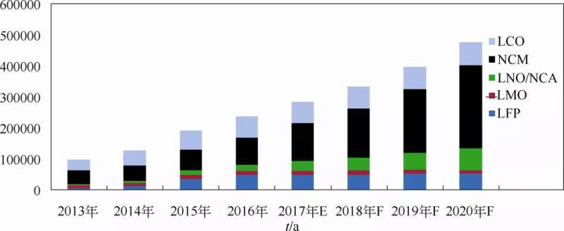 圖1 全球鋰電正極材料市場(chǎng)需求及預(yù)測(cè)