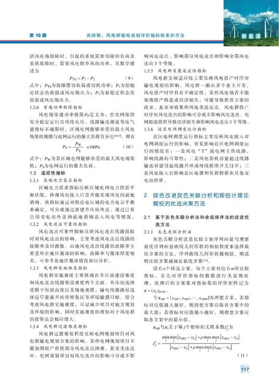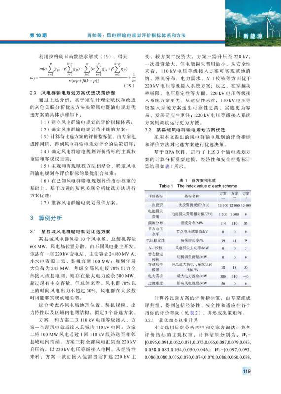 內(nèi)陸山地風(fēng)電、湖區(qū)風(fēng)電等風(fēng)電群,具有風(fēng)電分布范圍廣、單個風(fēng)電容量小等特點。針對風(fēng)電群的送出,首先,從經(jīng)濟性、安全性和適應(yīng)性等方面,建立了一套適用于風(fēng)電群輸電規(guī)劃的綜合評價指標(biāo)體系;然后,綜合考慮評價指標(biāo)的主客觀權(quán)重,利用基于矩估計理論的最優(yōu)組合賦權(quán)方法確定各指標(biāo)的最優(yōu)組合權(quán)值,并將灰色關(guān)聯(lián)分析法和余弦排序法結(jié)合,提出改進(jìn)的灰色關(guān)聯(lián)分析法,用以更加準(zhǔn)確合理地對各個方案進(jìn)行優(yōu)選;最后,利用所提出的評價指標(biāo)體系和評價方法對湖南某山地風(fēng)電群輸電規(guī)劃進(jìn)行了研究。研究結(jié)果驗證了所提出評價指標(biāo)體系和評價方法的有效性和可行性。