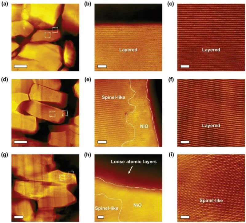 圖5. STEM-HAADF 表征顆粒在原始狀態(tài)(a-c)和500次循環(huán)后(d-i)晶體邊緣和中心結(jié)構(gòu)變化