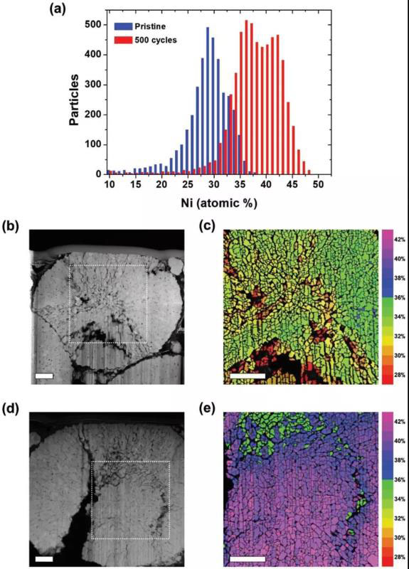 為了從化學(xué)和物理變化方面對NCM進行全面理解,深入理解電極材料在長循環(huán)過程的實際變化情況。德州大學(xué)奧斯汀分校 Arumugram Manthiram教授團隊使用基于電子顯微鏡的分析技術(shù),晶體和電子結(jié)構(gòu)變化的微觀結(jié)構(gòu)圖像。電子探針微分析(EPMA),X射線能量色散光譜(XEDS)和EELS與TEM結(jié)合的結(jié)果揭示了表面和體相正極上Ni含量,晶體結(jié)構(gòu)和氧化態(tài)的變化。通過比較原始正極和循環(huán)500次的正極來了解高Ni NCM正極改變與電性能的關(guān)系。實驗結(jié)果證實了正極中的局部降解,清楚地表明TMs的結(jié)構(gòu),化學(xué)組成和氧化態(tài)的變化會在較長的循環(huán)時間內(nèi)從表面?zhèn)鞑サ秸麄€體相,Ni2+的持續(xù)形成和O流失是導(dǎo)致高鎳NCM正極降解的主要問題。這項研究采用了各種分析工具,以表明高Ni NCM正極降解的新途徑,特別是在一次完整粒子水平上的分析,對高能長效電池的實際應(yīng)用具有重要指導(dǎo)意義。