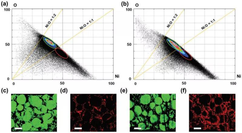 活性NCM顆粒元素流失表征:相比于量化元素的含量,比較元素比例和變化是更為合理的。在500次循環(huán)后Ni/O比例更多的向1:1擴展,表明在高Ni NCM正極中,不僅存在Ni向表面溶解問題,材料O的流失顯得更為嚴重。