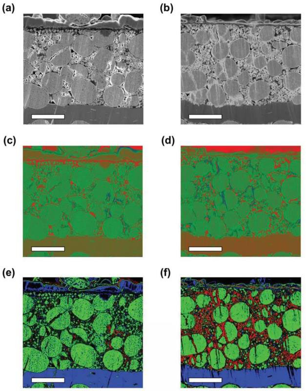 圖2. 電子束感應(yīng)電流法表征微尺度局域電阻特性(以溫度作為對比),(a,c,e)原始電極,(b,d,f)500次循環(huán)后
