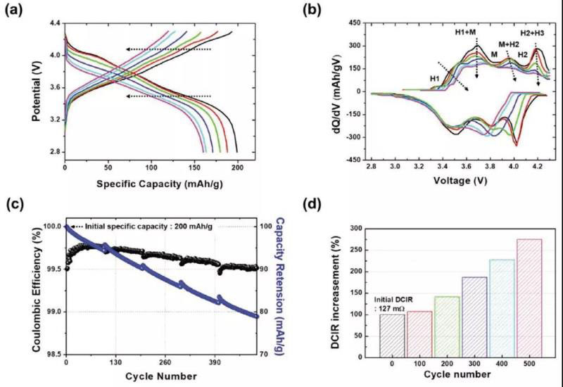 圖1. 電化學(xué)性能測試。a-b)恒電流充放電,相應(yīng)微分曲線,c-d)循環(huán)測試~庫倫效率,長循環(huán)過程的直流內(nèi)阻變化