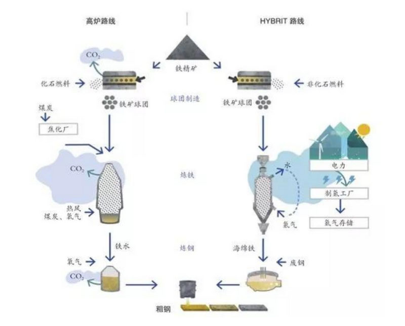 這項名為“突破性氫能煉鐵技術(shù)”的項目(HYBRIT, HYdrogen BReakthrough Ironmaking Technology),旨在用可再生電力生產(chǎn)的氫替代傳統(tǒng)煉鐵使用的焦炭。在傳統(tǒng)煉鐵工藝中,焦炭中的碳與鐵礦石中的氧反應(yīng)生成二氧化碳作為還原劑,如果使用氫氣替代焦炭,氫氣將與鐵礦石中的氧氣反應(yīng)生成水,實現(xiàn)煉鐵過程的零排放。