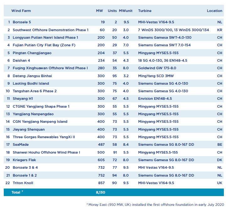 國(guó)家能源局2020年2月發(fā)布的顯示,2019年中國(guó)海上風(fēng)電新增裝機(jī)198萬(wàn)千瓦,截止到2019年底,中國(guó)海上風(fēng)電累計(jì)裝機(jī)593萬(wàn)千瓦。國(guó)家能源局7月31日發(fā)布的《2020年上半年風(fēng)電并網(wǎng)運(yùn)行情況》顯示,2020年上半年,全國(guó)風(fēng)電新增并網(wǎng)裝機(jī)632萬(wàn)千瓦,其中陸上風(fēng)電新增裝機(jī)526萬(wàn)千瓦、海上風(fēng)電新增裝機(jī)106萬(wàn)千瓦。截止6月底,全國(guó)海上風(fēng)電累計(jì)裝機(jī)699萬(wàn)千瓦。在2020年8月中國(guó)可再生能源學(xué)會(huì)風(fēng)能專(zhuān)委會(huì)發(fā)布的《中國(guó)風(fēng)電產(chǎn)業(yè)地圖2019》報(bào)告中顯示,中國(guó)2019年海上風(fēng)電新增249萬(wàn)千瓦,截止2019年底總的吊裝容量數(shù)據(jù)超過(guò)703萬(wàn)千瓦,即中國(guó)裝機(jī)已超過(guò)7GW。