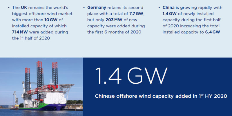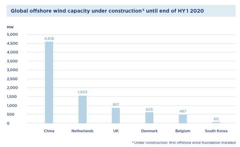 該報(bào)告發(fā)現(xiàn),按國(guó)家和地區(qū)劃分,英國(guó)仍然是全球最大的海上風(fēng)電市場(chǎng)。英國(guó)的裝機(jī)容量超過(guò)10GW,其中,2020年上半年新增714MW。