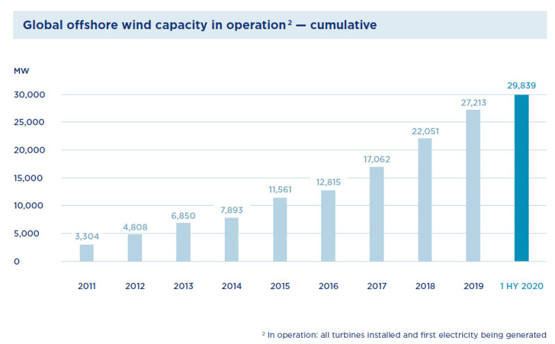 截止2020年上半年,全球在運(yùn)行海上風(fēng)電總?cè)萘?9839MW,接近30GW。