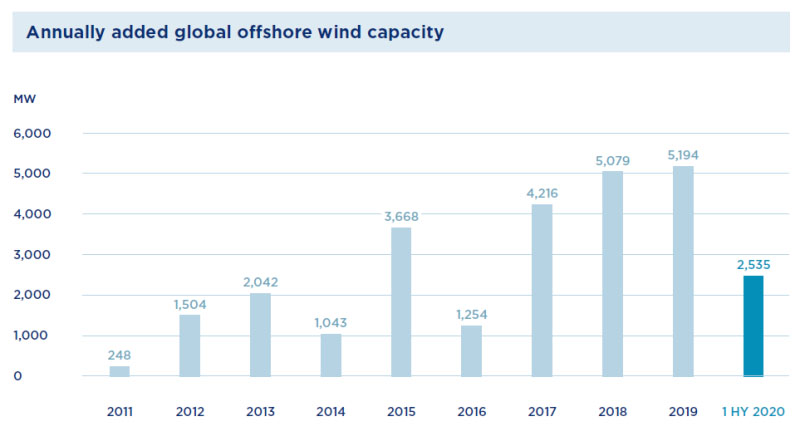 2020年上半年海上風(fēng)電新增裝機(jī)約2.5GW