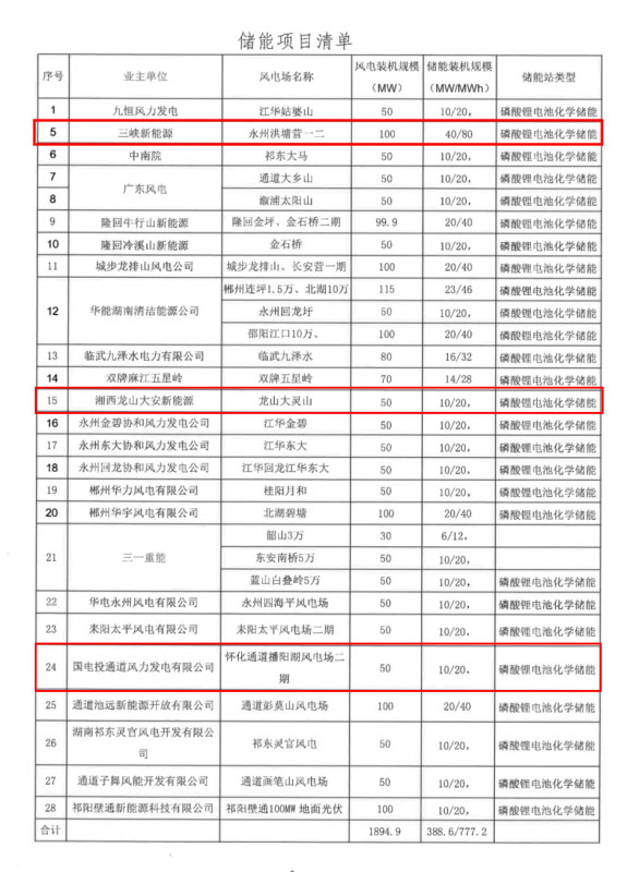 今年3月,國網(wǎng)湖南省電力有限公司發(fā)展部曾下發(fā)《關(guān)于做好儲能項目站址初選工作的通知》,文件顯示湖南28家企業(yè)承諾新能源發(fā)電項目配套儲能,總規(guī)模達388.6MW/777.2MWh。此次啟動招標的三個項目均位列其中。