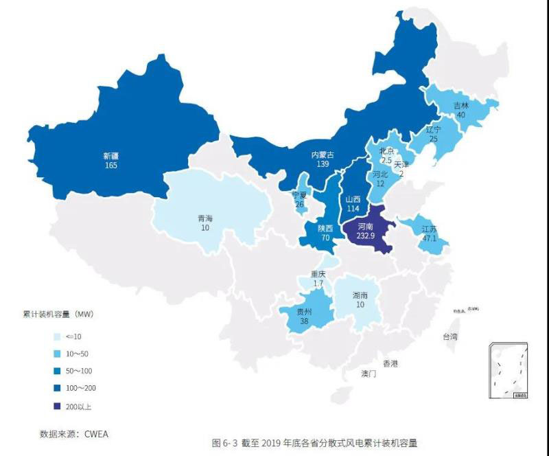 2019年,中國(guó)分散式風(fēng)電(分散式、分布式、智能微網(wǎng))新增裝機(jī)容量為300MW,同比增長(zhǎng)114.8%;累計(jì)裝機(jī)容量達(dá)到935MW,同比增長(zhǎng)47.8%。截止2019年底,共有9 家制造企業(yè)和36 家開(kāi)發(fā)商有分散式風(fēng)電裝機(jī)。其中主要分布的省區(qū)為河南、新疆、內(nèi)蒙古、山西、陜西等。