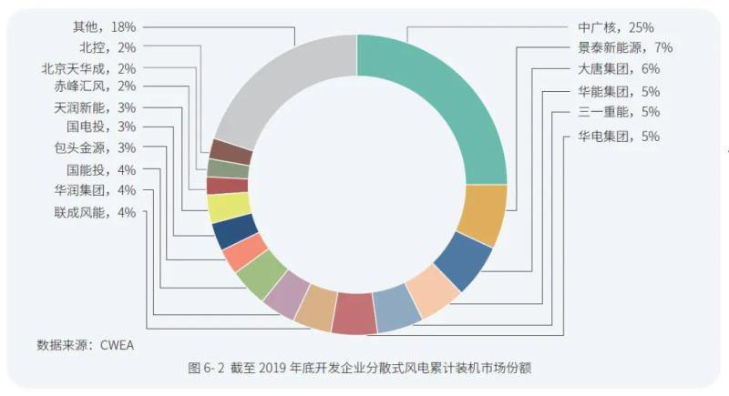 圖6- 2 截至2019 年底開(kāi)發(fā)企業(yè)分散式風(fēng)電累計(jì)裝機(jī)市場(chǎng)份額