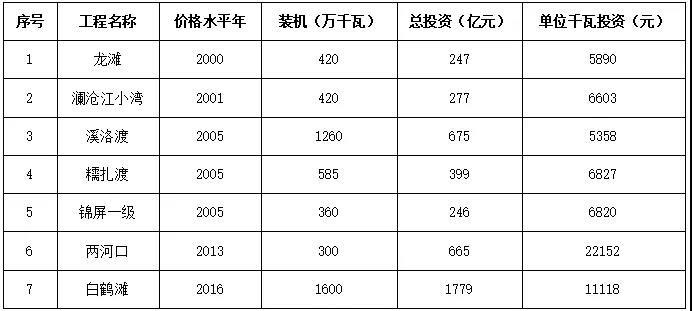 篩選我國2000年以來開工建設(shè)符合調(diào)節(jié)庫容≥50億立方米;調(diào)節(jié)性能≥年調(diào)節(jié);裝機(jī)規(guī)?!?00萬千瓦三個(gè)條件的水電站,工程投資情況見表1。