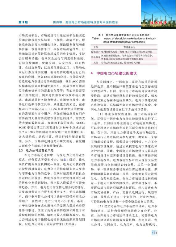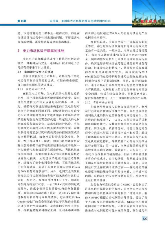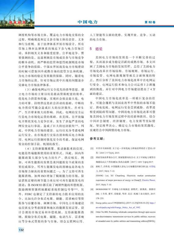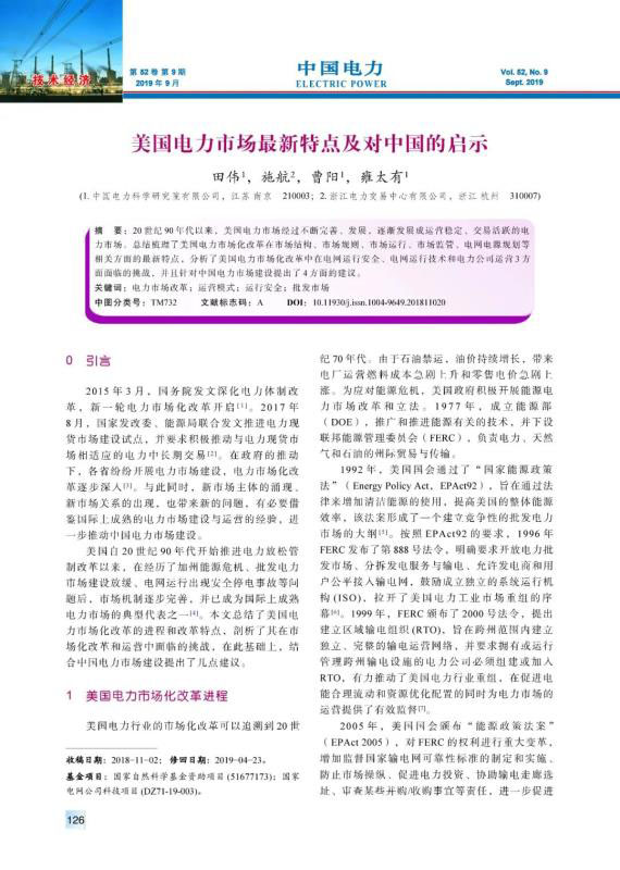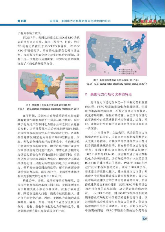 20世紀90年代以來,美國電力市場經(jīng)過不斷完善、發(fā)展,逐漸發(fā)展成運營穩(wěn)定、交易活躍的電力市場??偨Y梳理了美國電力市場化改革在市場結構、市場規(guī)則、市場運行、市場監(jiān)管、電網(wǎng)電源規(guī)劃等相關方面的最新特點,分析了美國電力市場化改革中在電網(wǎng)運行安全、電網(wǎng)運行技術和電力公司運營3方面面臨的挑戰(zhàn),并且針對中國電力市場建設提出了4方面的建議。